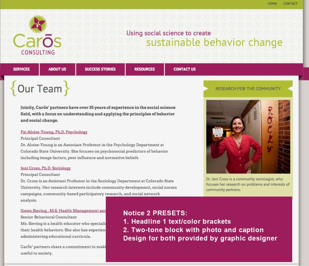 See examples of customized presets below; one allows for triple columns with block headings in each; the other shows customized Headline 1 as well as floating two-tone box with photo and caption.