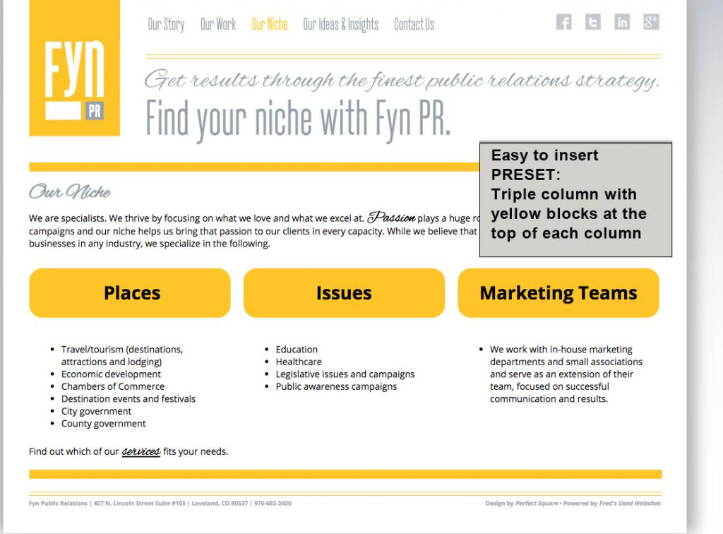 TRY THIS HERE: Select the "Floating Block Right (with image)" preselect. You should immediately see a highlight box with a truck image and some default content. Just change the image to something else and type in your content for a near instant highlight! Preset content items can be added to your site at any time and we can have as many as makes sense for you.